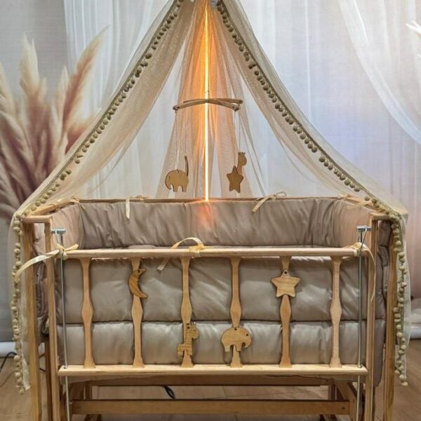 سایز : ۶۰*۱۰۰ سانتی متر سرویس روتختی کامل بهمراه پشه بند : دارد حالت ننو : دارد بغل بازشو : دارد ارتفاع قابل تنظیم : دارد چراغ خواب : دارد آویز تخت : دارد رده سنی : از بدو‌تولد تا ۳ سالگی جنس چوب سه لایه و قابل استفاده برای نوزاد تا 3 سالگی کودک