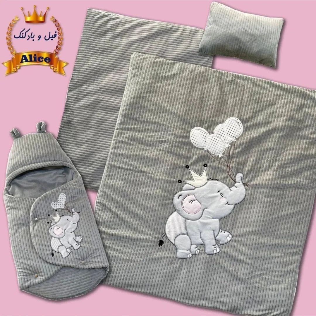 سرویس خواب حبابی آلیس با طراحی فیلی جذاب و ترکیب چهار تکه کاربردی شامل تشک بالش، لحاف و پتودورپیچ، راهحلی کامل برای خوابی راحت و ایمن نوزاد شماست.